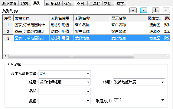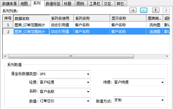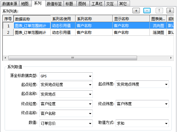 由于实际业务中需要以流向图展示订单流向,以散点展示各公司订单总额大小,因此,系列中设置两个系列。