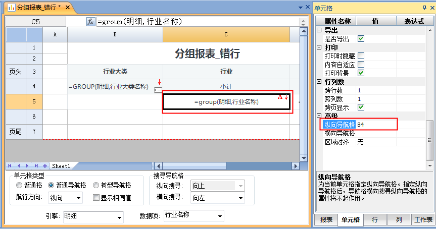 由于 B4 和 C5 所在单元格不在同一行,使用默认的导航方式无法满足,因此,需要选中 C5 单元格,在单元格属性中的“纵向导航格”中输入”** B4 **”(这时单元格右上角会显示红色的 A 字符标识),代表 C5 单元格强制跟随 B4 导航扩展,其数据约束关系跟同行/列导航自动导航是一致的。如下图: