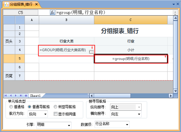 导航关系默认是在同行或同列中自动搜寻构建的,如果需要对不在同行或同列内的单元格之间构建导航关系时,就需要用到强制指定纵向导航格或横向导航格来实现。
