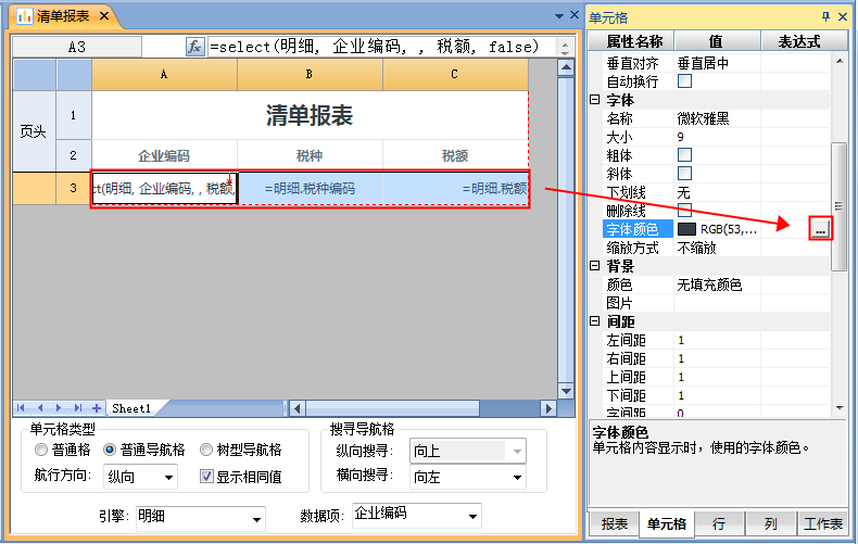 选中企业编码、税种和税额所在单元格,通过单元格属性中的“字体颜色”设置属性表达式,入口如下图: