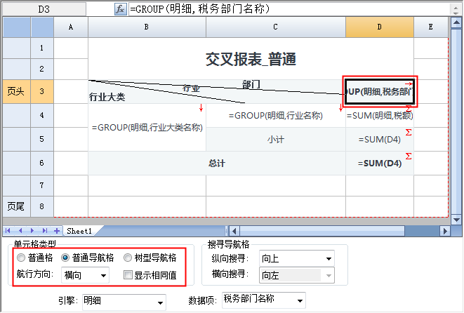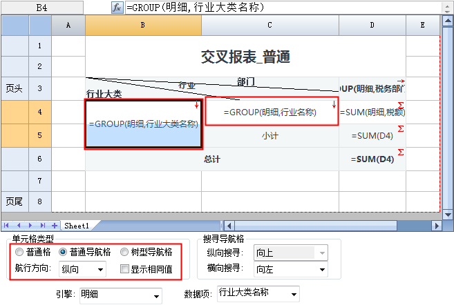 导航单元格在执行导航时,支持纵向、横向两个轴向上同时扩展,需要横向扩展时,只需要在默认导航格设置基础上改变一下导航方向即可,适用于交叉报表的应用场景。