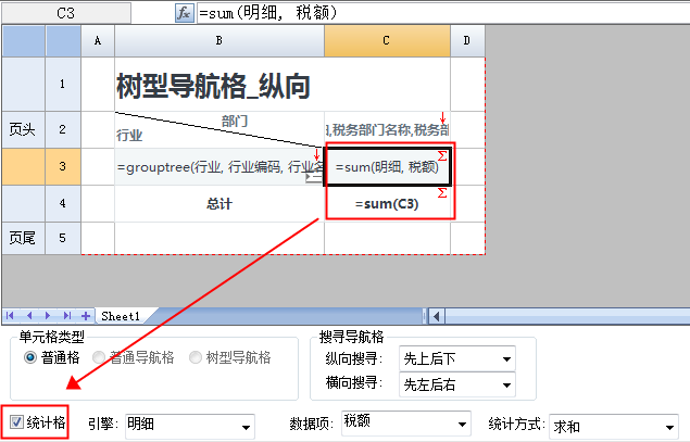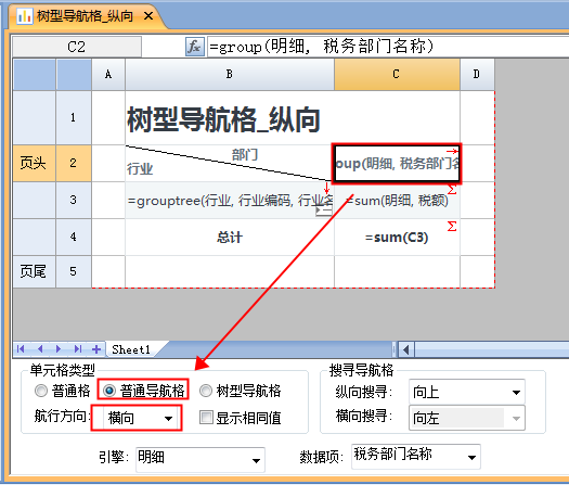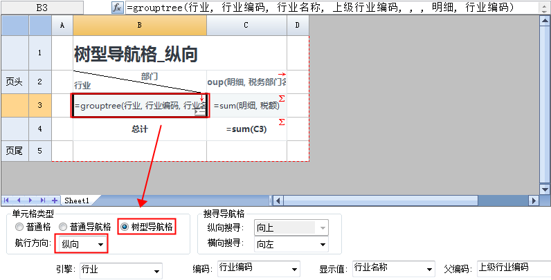 设置B3单元格为“树型导航格”,航行方向为“纵向”,如下图:
