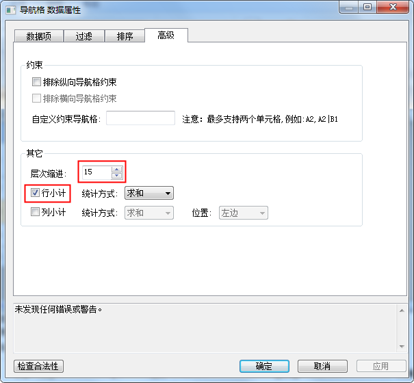 在“高级”中设置不同层级内容的偏移距离;勾选“行小计”,表示该导航树需要自动的列小计功能,如下图: