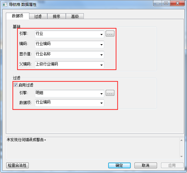 然后双击B3单元格,在弹出的“导航格 数据属性”窗口中,选中“启用过滤”复选框,设置引擎为“明细”,数据项为“行业编码”,如下图: