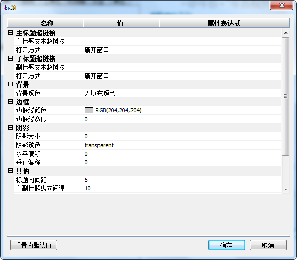 高级:打开标题相关高级属性设置窗口,包括主副标题的超链接、标题背景颜色、标题边框线颜色、边框线宽度、标题内间距、主副标题纵向间隔等。在该窗口可以设置这些属性值,如需为动态属性值,在“属性表达式”列可以设置相应的属性表达式。