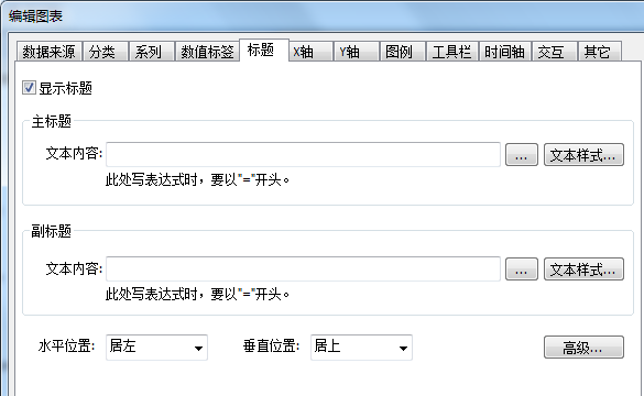 主标题文本内容:支持表达式,以”=”开头,点击后面的”…”按钮,可以打开表达式定义窗口。