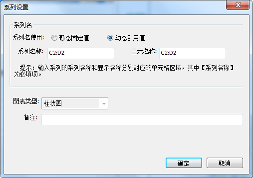 系列名称、显示名称,指系列的文本标签内容,可以是动态的或静态的。如果是动态扩展的,扩展出几个不同值,则最终图表就有几个系列。