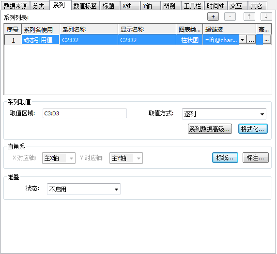 系列数据主要包括系列名称、显示名称、图表类型、超链接、系列取值、直角系以及堆叠。
