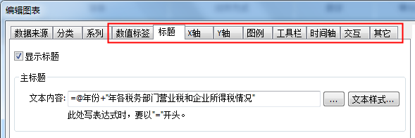 1 概述1.1 应用场景1.2 功能介绍2 图表样式介绍1 概述1.1 应用场景本文将对图表样式设置项的通用设置做详细介绍,如果个别图表有特别的样式设置,那么会单独在这些图表的文档中说明。1.2 功能介绍图表样式通用属性包括:标题、数值标签、坐标轴、图例、工具栏、其它,如下图所示:2 图表样式介绍图表通用样式内容较多,因而采用索引的方式进行介绍,如下表所示: 样式名称 帮助文档 标题 图表标题 数值标签 图表标签 坐标轴 图表坐标轴 图例 图表图例 工具栏 图表工具栏 其它 其它 作者:fancy 创建时间:2023-11-20 16:14最后编辑:fancy 更新时间:2025-09-30 12:01