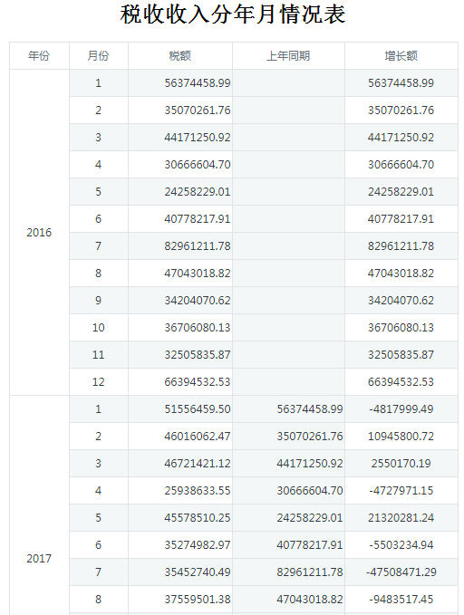 以税收收入为例,将某年某月与上年对应月份的数据进行比较,得出增值额,如下图: