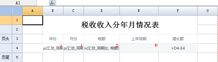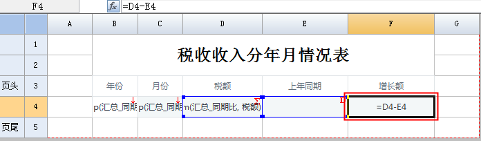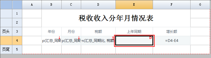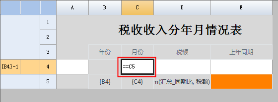 在上图中,“{B4} -1”偏移行在C4单元格输入了过滤条件后,即表示了对应当前单元格的上年同期所在行。最后,我们就可以在当前单元格 E5 上,输入表达式:=D4,即上年同期的税额值。如下图: