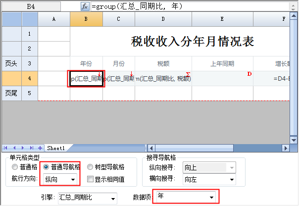 1)设置B4、C4单元格为普通导航格,航行方向均为“纵向”,不同的是数据项:B4选择“年”,C4选择“月”,如下图: