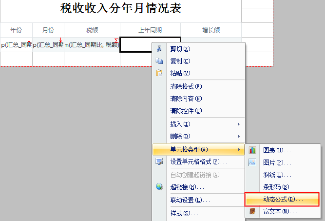 由于 E4单元格要得到上年同期的税额,这里我们需要用到动态公式。右击E4单元格,选择[单元格类型>动态公式],如下图: