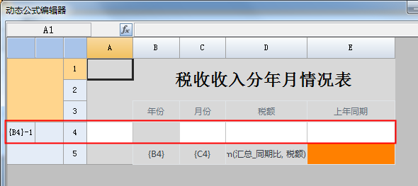 在上图中可以看出动态公式编辑器在首次打开时,加载了原始报表设计区域信息,包括导航信息。红色单元格为当前单元格,在此例中为 E4 单元格,E4 单元格逐级受限 C4,B4 两个导航格约束,含义分别为“月份”、“年份”。现在要在 E4 上取得上年同期,即对应当前单元格“年份”导航格的上一条记录,所以需要在 B4 单元格上增加偏移行,如下图: