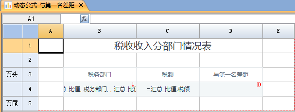 在此例中D4单元格为当前单元格,D4单元格逐级受限B4导航格约束,含义为“税务部门”。现在要在D4用到第一名的记录,在上一步时,B4单元格的的数据已经设置了降序排序,第一名,即是第一条记录,所以B4导航格扩展的第一条就是第一名。在B4上右击弹出菜单,选择“增加偏移行”,在“增加偏移行”窗口中设置“绝对偏移 1”,点击“确定”,结果如下图: