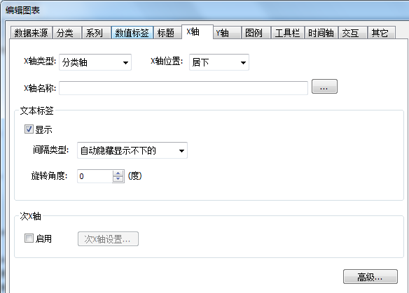 若需要用到第二个X轴,则启用次X轴,同时进行次X轴设置,类似主X轴设置。如下图: