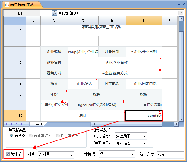 需要对税额进行汇总,将 E10 单元格设置为“统计格”即可,如下图: