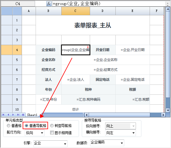 从表单布局可以看出,企业信息、经营方式、法人、固定电话均与导航格不在同一行,想要以C4 单元格进行数据扩展,那么就分别为以上单元格设置强制导航(纵向导航格设置为:C4),如下图: