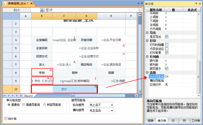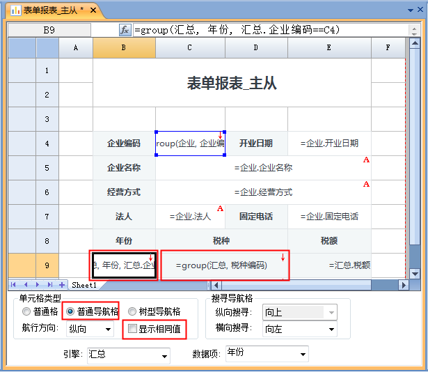 一个企业对应多条税额信息且是分组显示的,因此需要分别将从表信息中的 B9 和 C9 单元格设置为“普通导航格”,如下图: