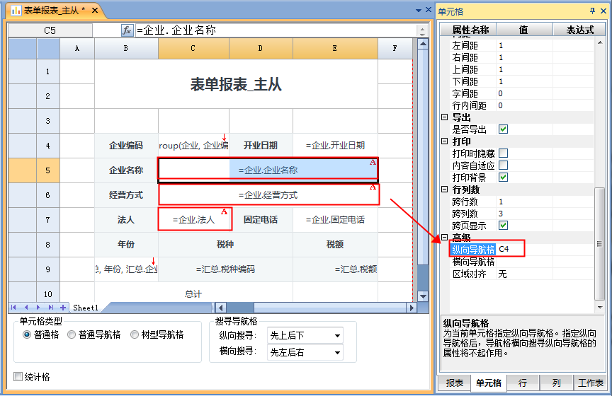同样,从表信息要跟随主表导航格进行扩展,从表每行中的第一个单元格都需要设置强制导航(纵向导航格设置为:C4),如下图:
