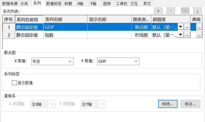 - “GDP”作为图表散点图系列,分别设置:X取值-年份、Y取值-GDP;