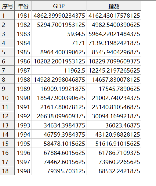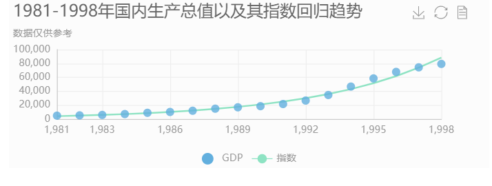 以折线散点混搭图的方式展示“1981-1998年国内生产总值以及其指数回归趋势”,效果如下:
