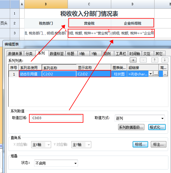 示例中存在“营业税”和“企业所得税”两个系列,因此设置如下: