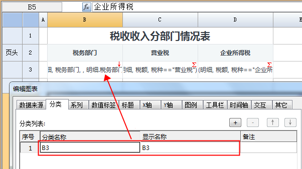 以“税务部门”作为图表的分类,分类名称和显示名称设置为 B3 单元格,如下图: