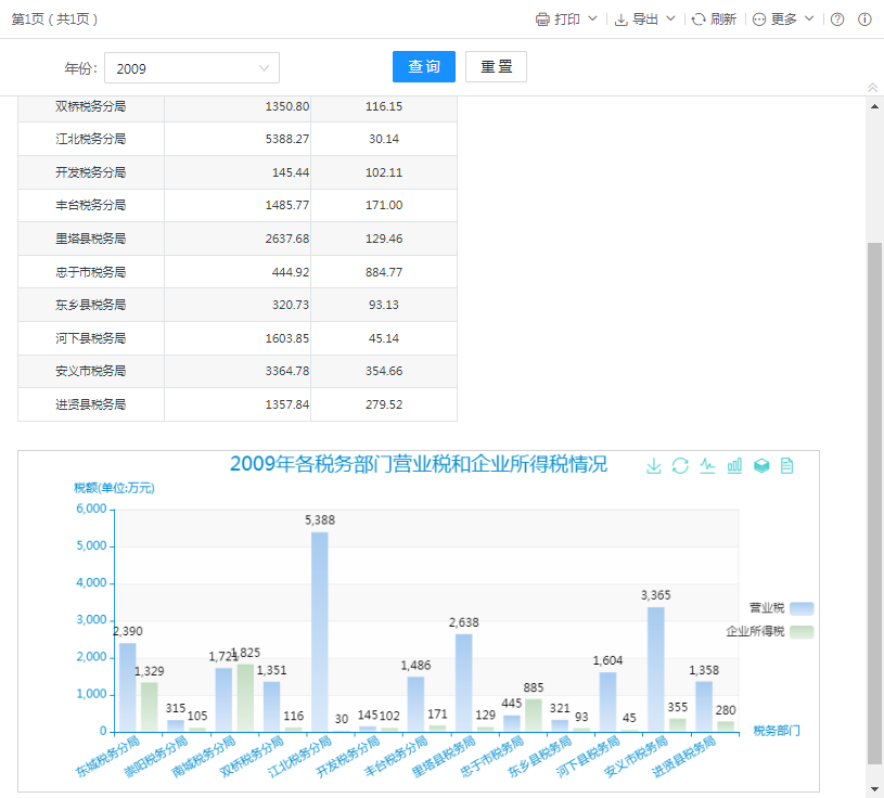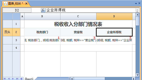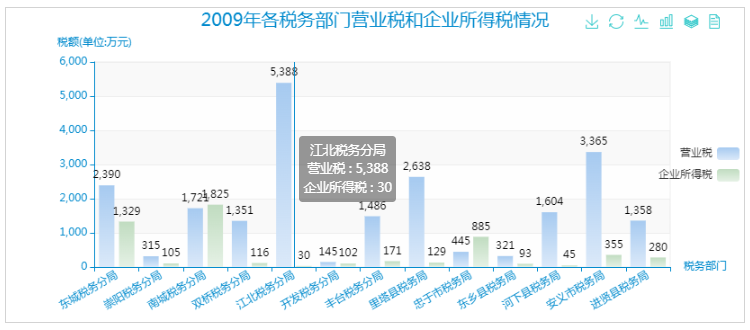 以柱状图的方式展示“各税务部门营业税和企业所得税情况”,效果如下: