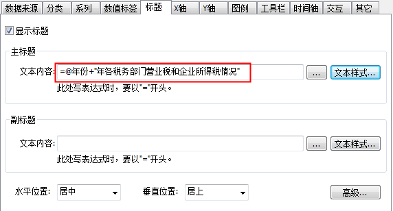 设置图表主标题为“=@年份+”年各税务部门营业税和企业所得税情况””,如下图: